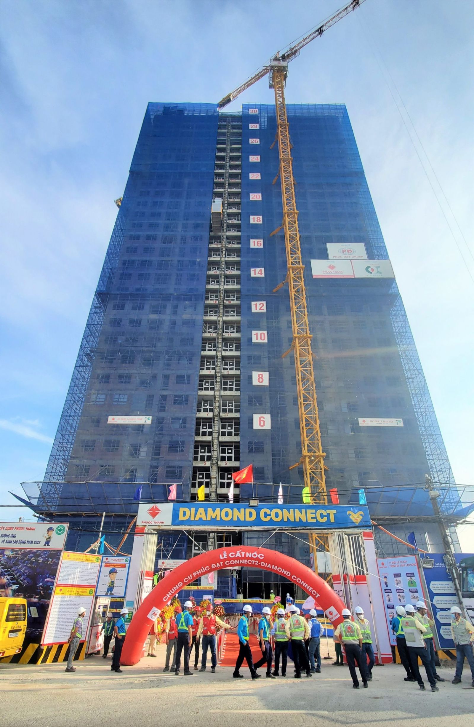 Toàn cảnh Chung cư 30 tầng hoành tráng trong buổi lễ cất nóc Chung cư Phúc Đạt Connect 2 Diamond Connect với quy mô: 2 block, cao 30 tầng gồm: 724 căn hộ. Và bổi lễ cất nóc diễn ra đánh dấu sự phát triển lớn mạnh và từng bước khẳng định được địa vị trên thị trường nhà đất và chung cư.
